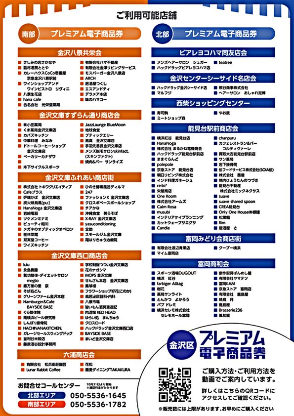 商品券の使える金沢区内商店街を二つの地域(南部、北部)に分かれていますのでご注意願います。
